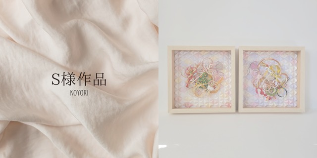 額タイプとの違いはガラス面があること。ガラス面に記念日などのステッカーをOPTIONで貼ることができます。背景にご祝儀の袋の部分をカットして使うことができたり、思い出アイテムを入れることができることは額タイプと同じで、コヨリ作品の特徴でもあります。人気の高い作品タイプです。
