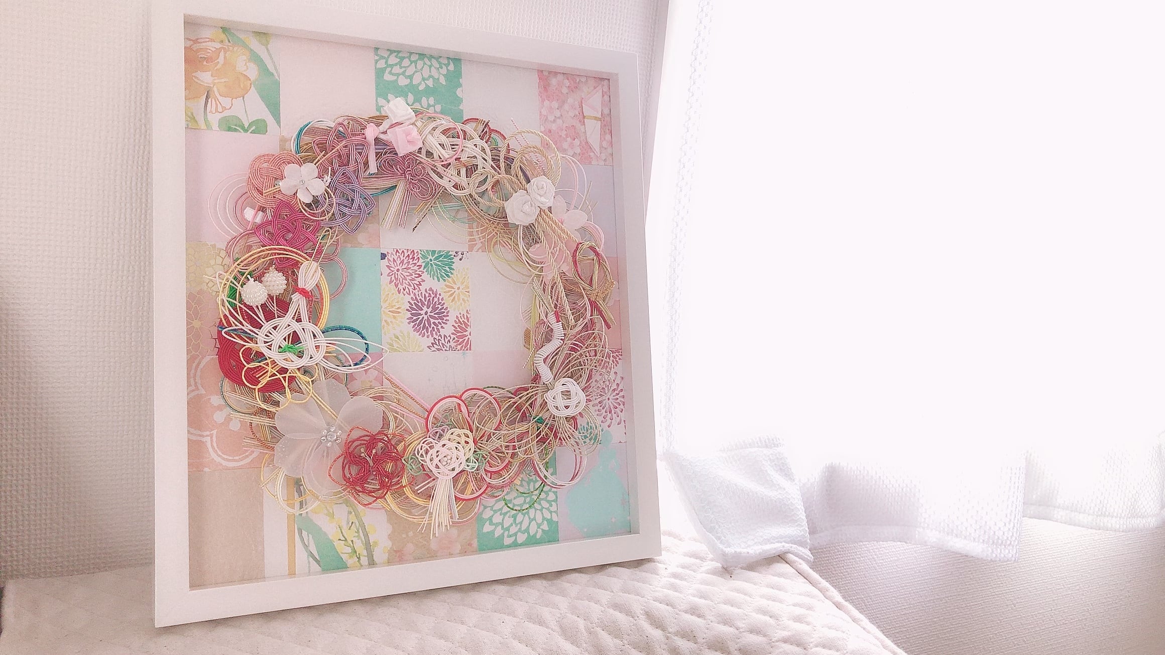 お客様の水引の数やご要望の大きさに合った額をその都度、仕入れに行っております。色紙サイズの額は、壁にも掛けることができ、額縁もパステルカラー調のものがあります。おしゃれ感があることと、背景にご祝儀袋をカットしたものを使うことができることも人気の理由だと思います。