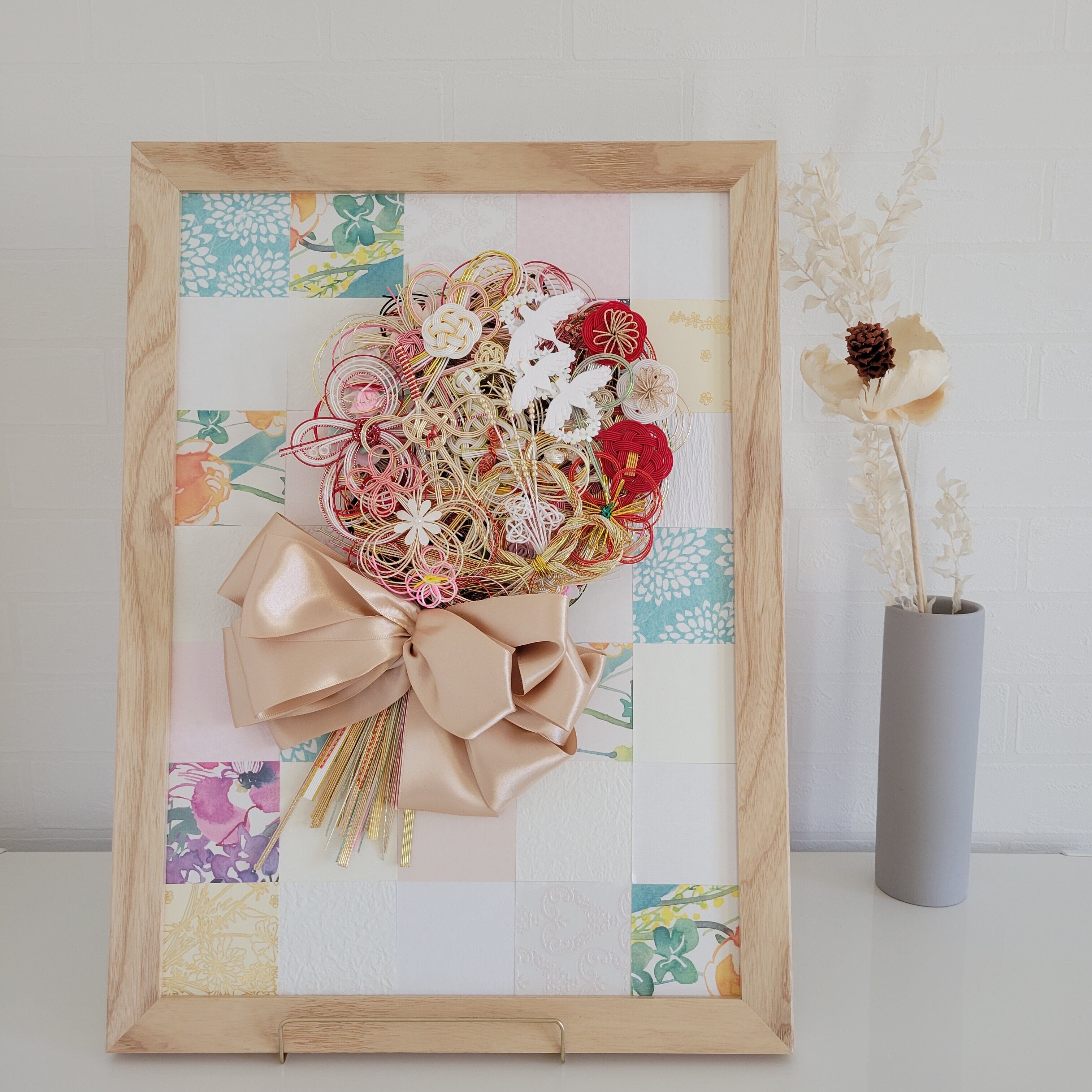 お客様の水引の数やご要望の大きさに合った額をその都度、仕入れに行っております。色紙サイズの額は、壁にも掛けることができ、額縁もパステルカラー調のものがあります。おしゃれ感があることと、背景にご祝儀袋をカットしたものを使うことができることも人気の理由だと思います。