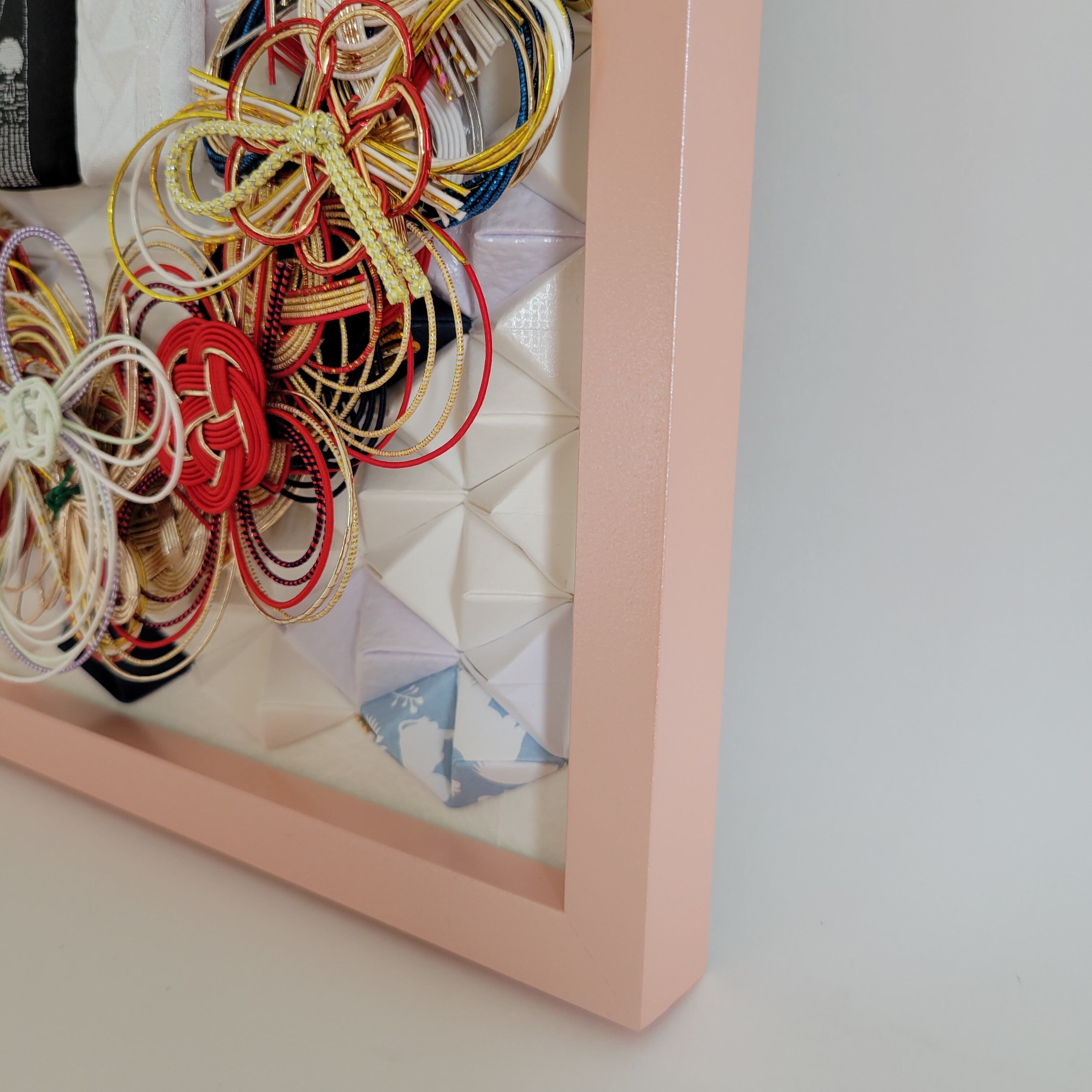 お客様の水引の数やご要望の大きさに合った額をその都度、仕入れに行っております。色紙サイズの額は、壁にも掛けることができ、額縁もパステルカラー調のものがあります。おしゃれ感があることと、背景にご祝儀袋をカットしたものを使うことができることも人気の理由だと思います。