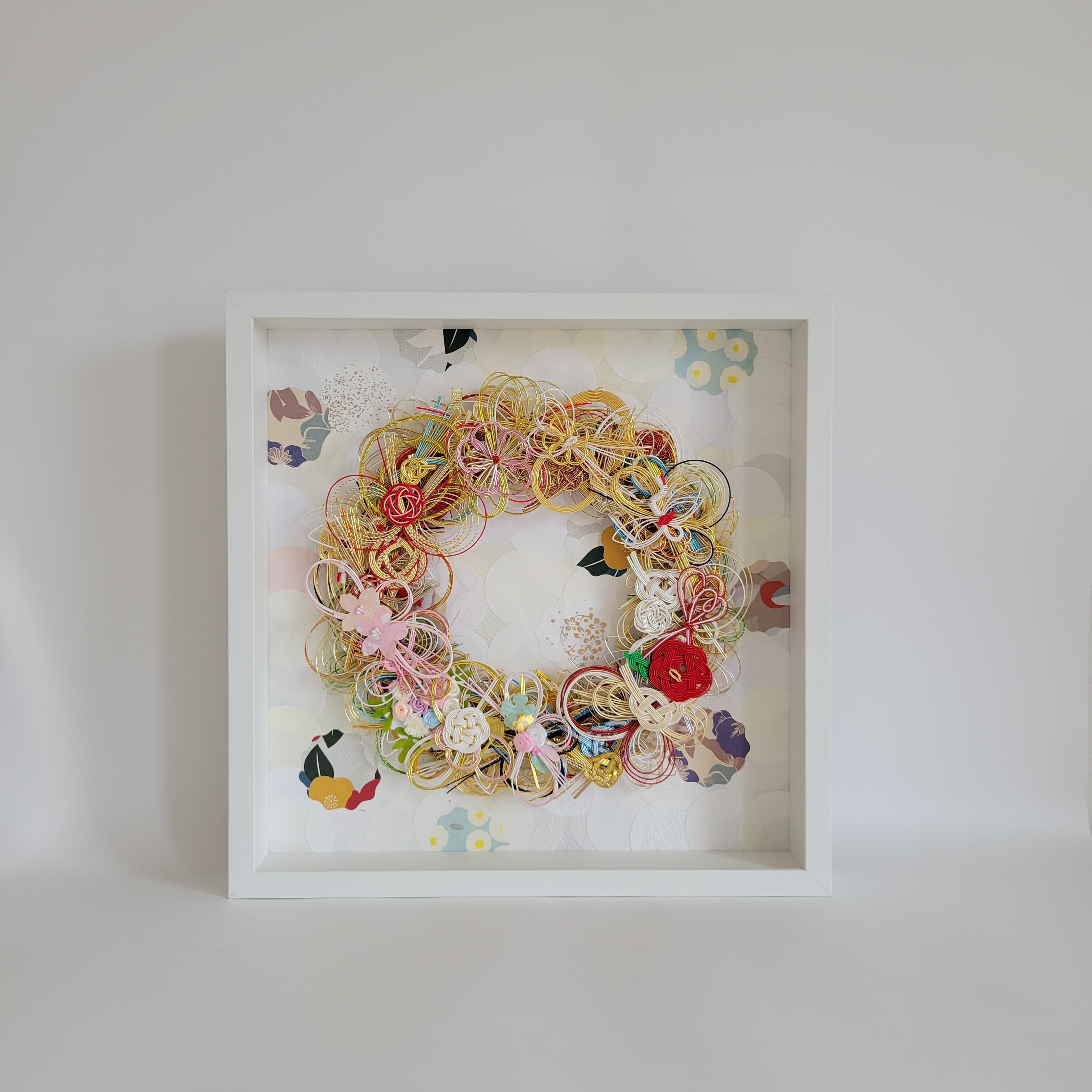 お客様の水引の数やご要望の大きさに合った額をその都度、仕入れに行っております。色紙サイズの額は、壁にも掛けることができ、額縁もパステルカラー調のものがあります。おしゃれ感があることと、背景にご祝儀袋をカットしたものを使うことができることも人気の理由だと思います。