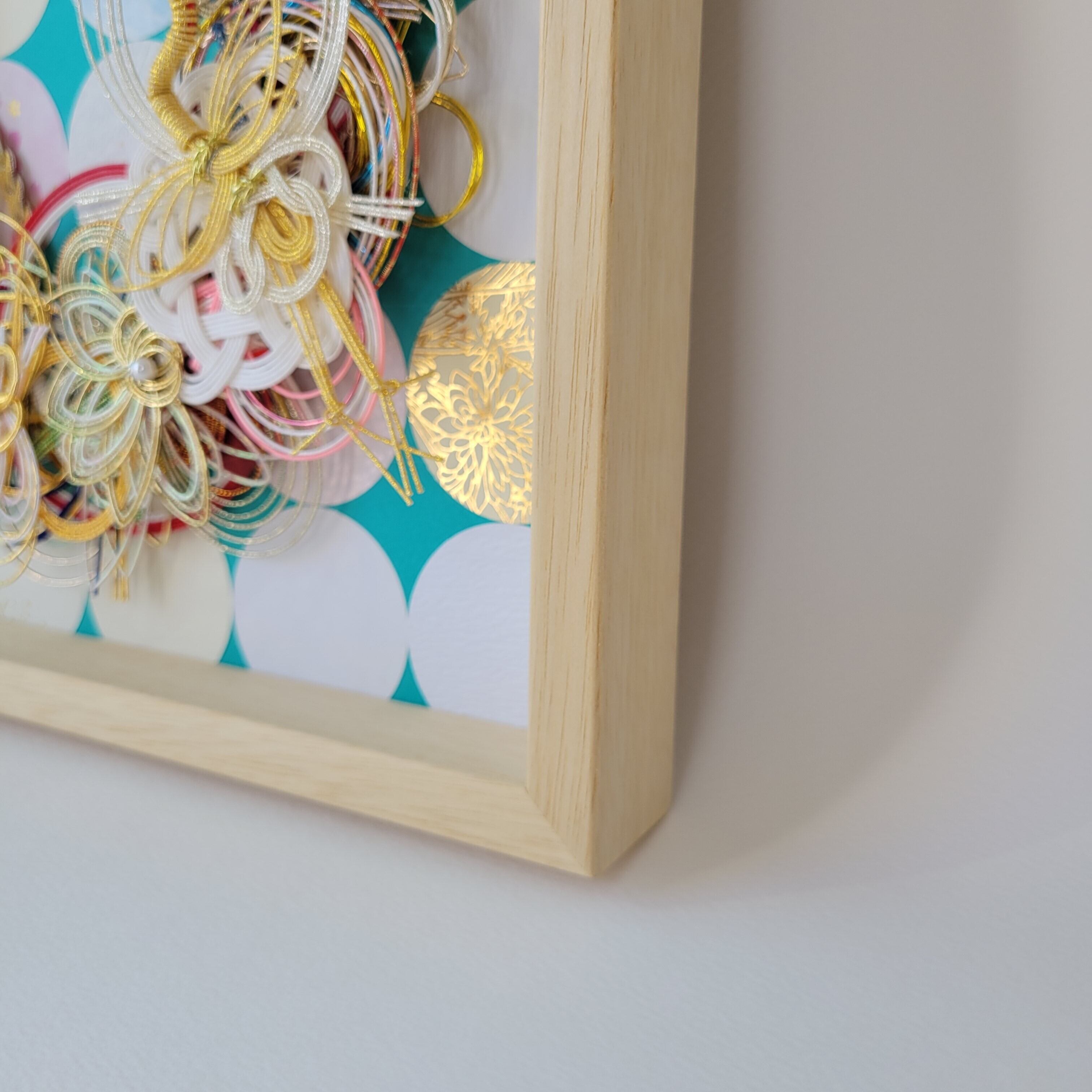 水引飾りをリースや花束の形にして入れるとインテリアになじむような作品になります。