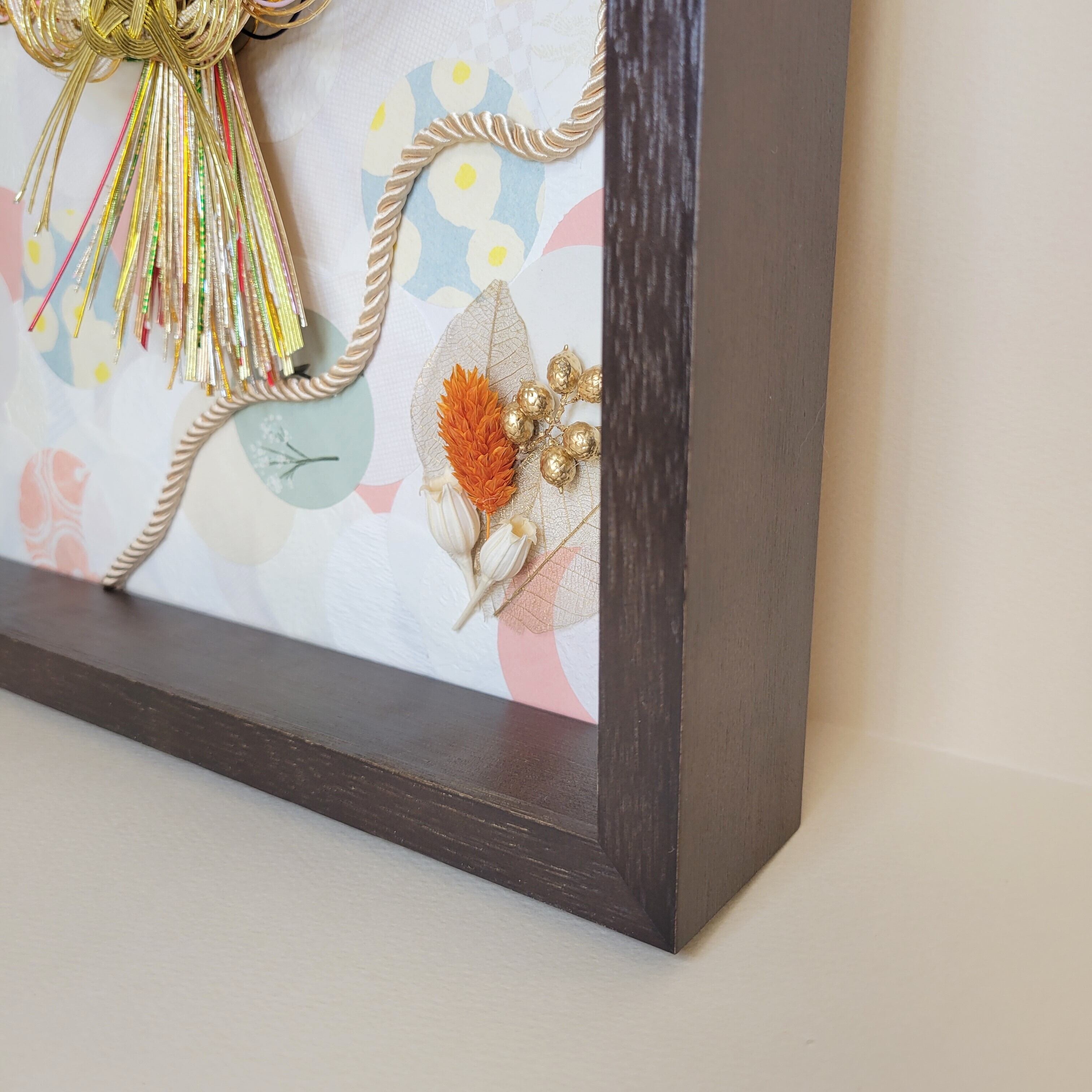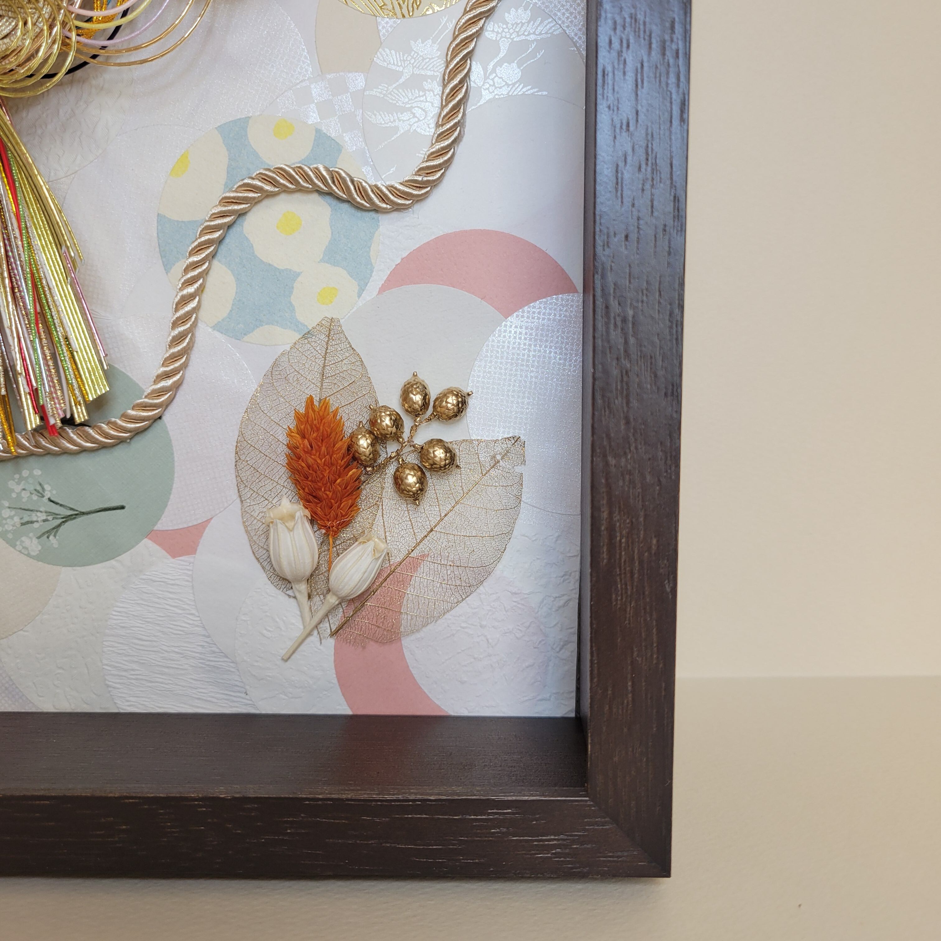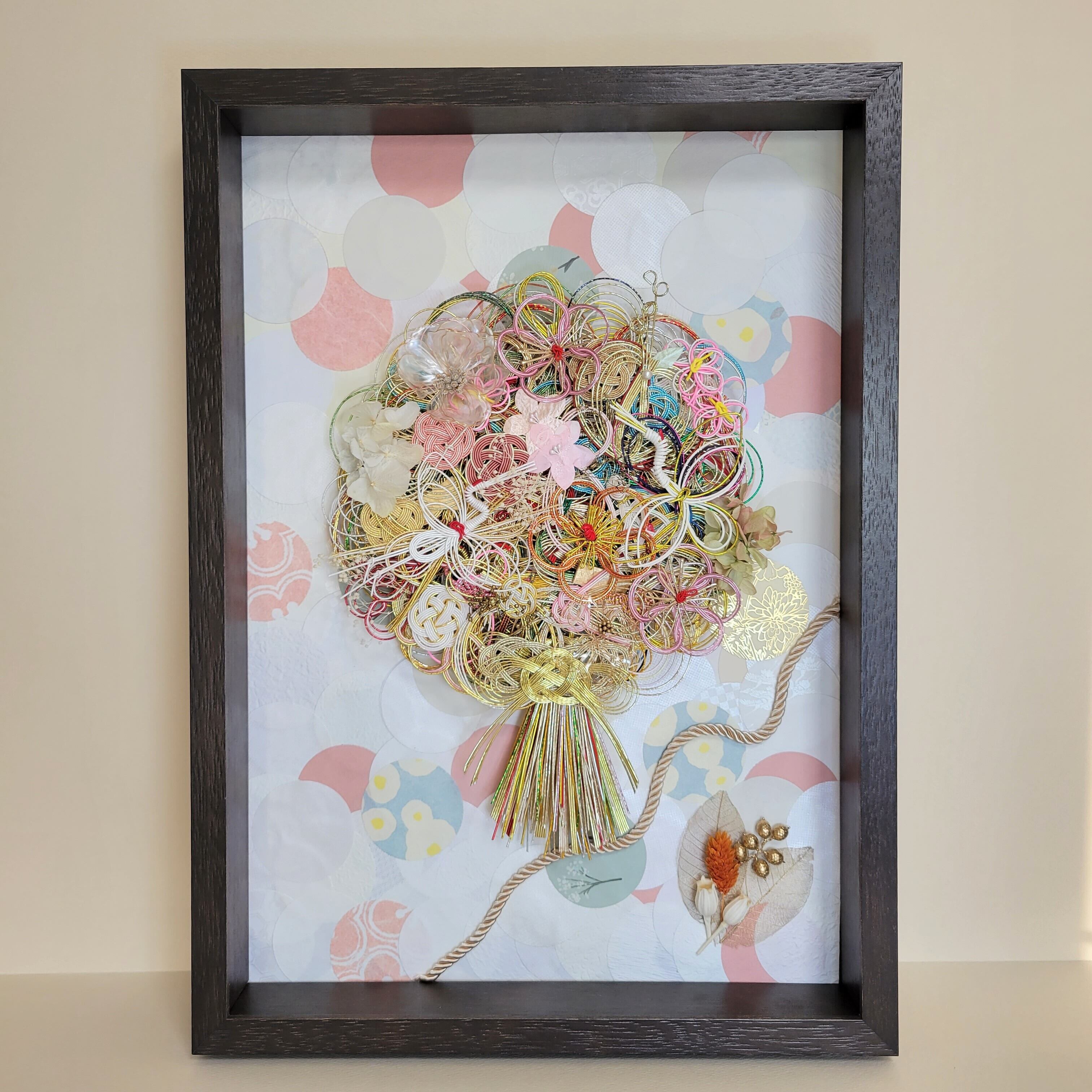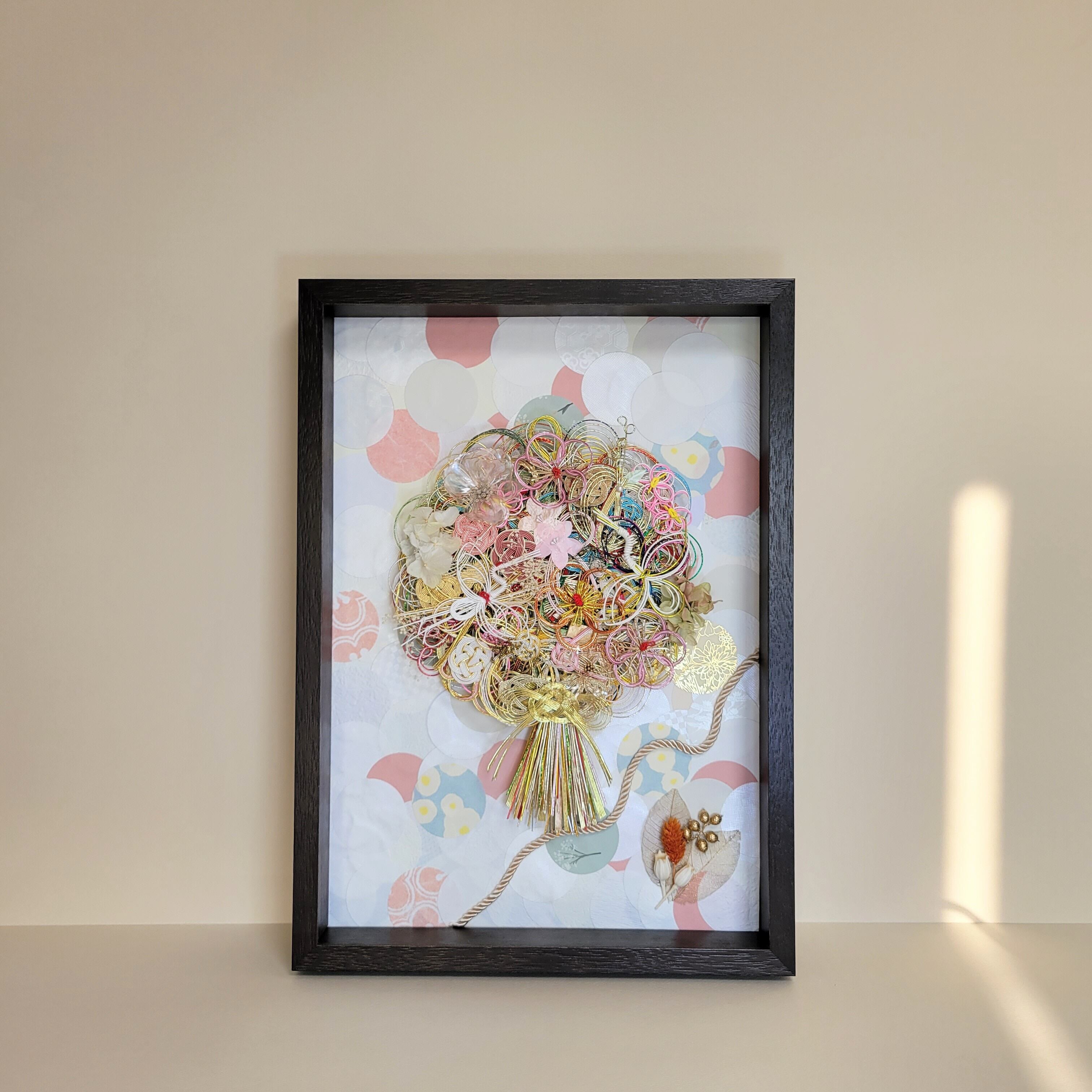 水引飾りをリースや花束の形にして入れるとインテリアになじむような作品になります。