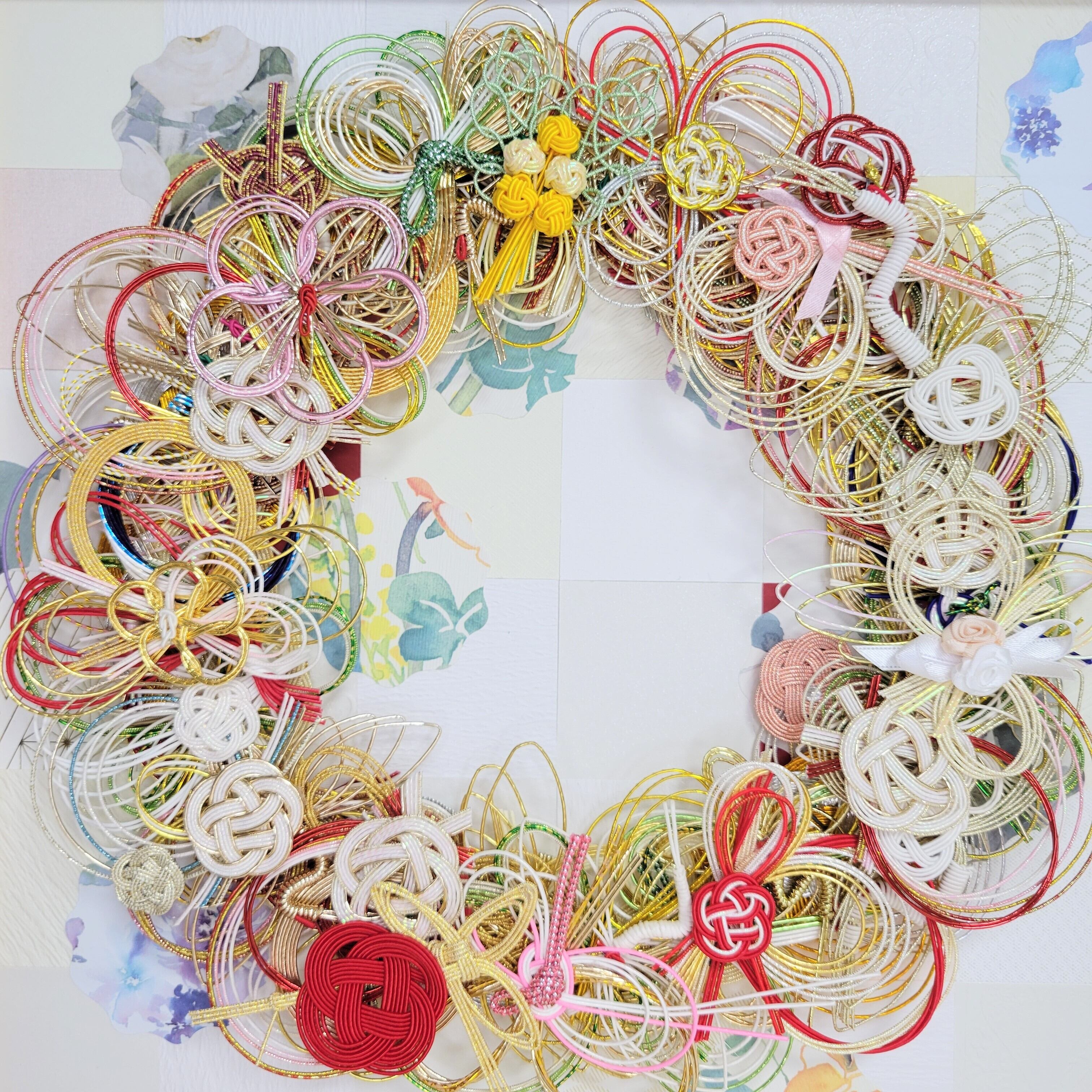 水引飾りをリースや花束の形にして入れるとインテリアになじむような作品になります。