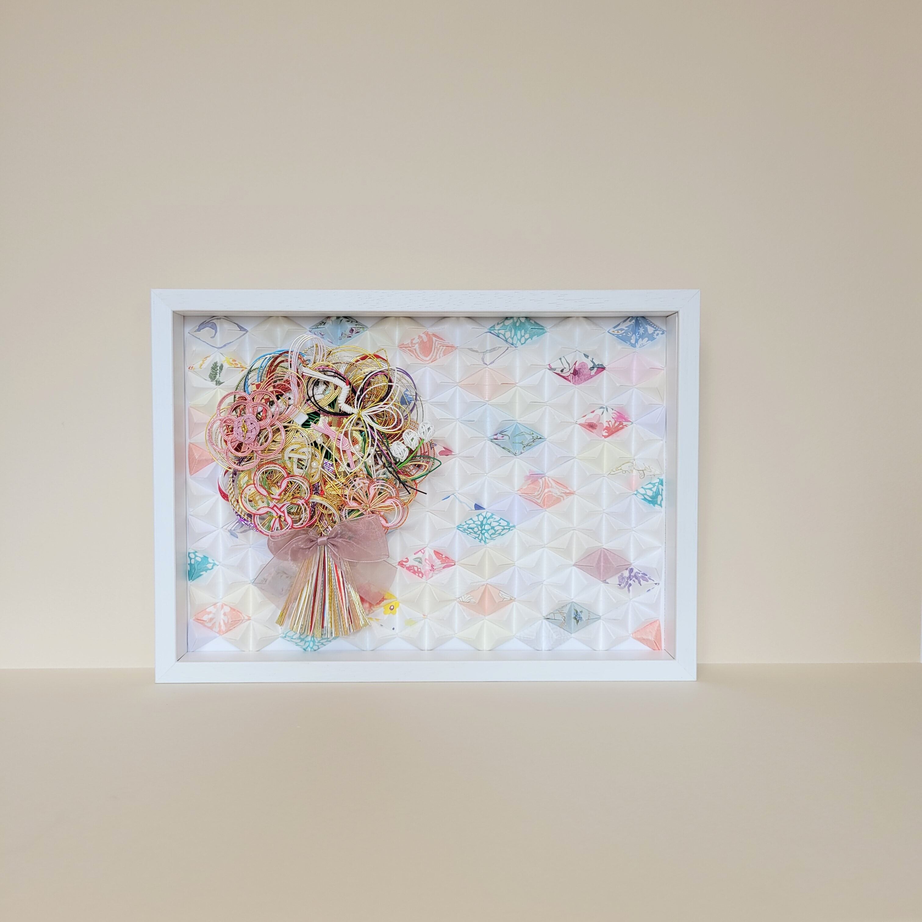 水引飾りをリースや花束の形にして入れるとインテリアになじむような作品になります。